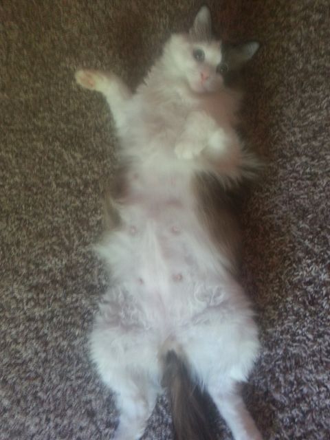 The ragdoll coat is medium-long to long. Its defining characteristic is its rabbit-like texture. It is not cottony or wooley like other longhaired cats, and is not always as long as some breeds. It feels, to me, like the coat came from the lovechild of a unicorn and a chinchilla, with a little cloud mixed in. The coat is remarkably low maintainance for a longer haired cat. The outer guard hairs are soft, and the undercoat is minimal on most Ragdolls. Shedding is also minimal except in Spring and Fall, when the loose hairs should be brushed out daily.